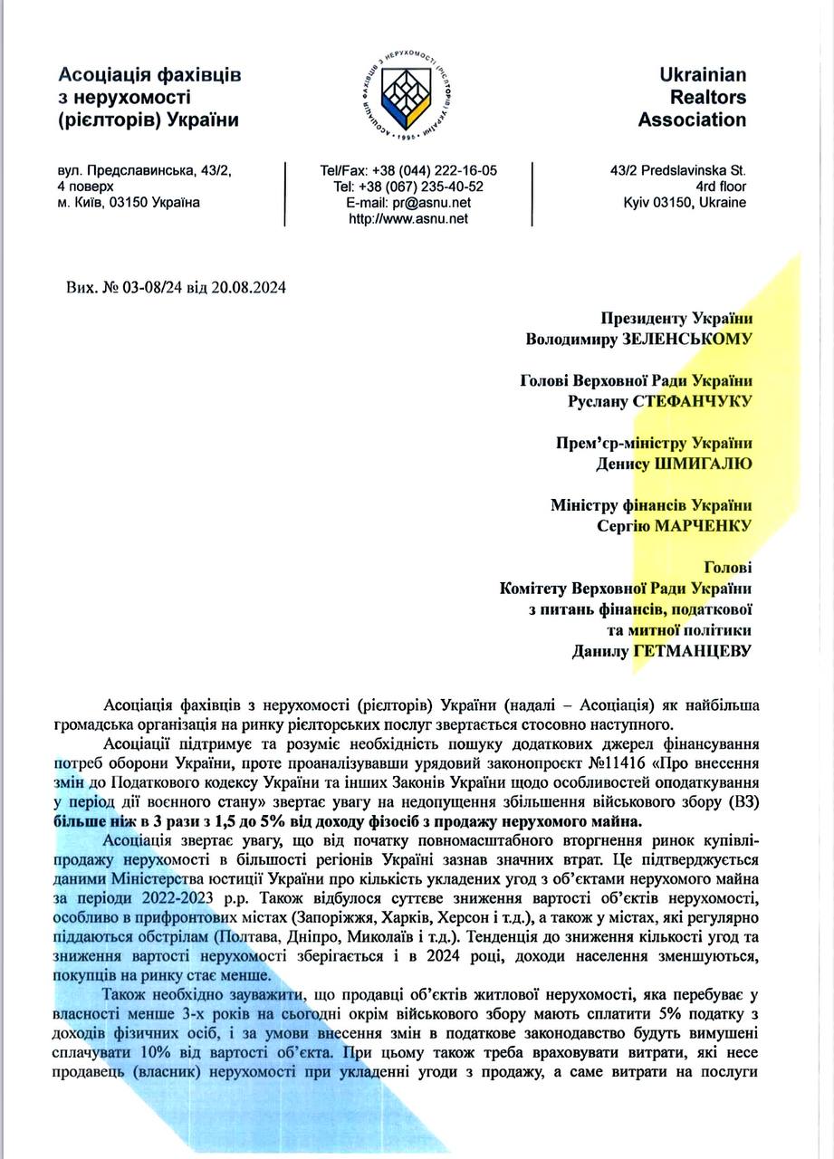 20 серпня 2024 року Асоціація фахівців з нерухомості (рієлторів) України звернулась з листом до Президента України, Верховної Ради та представників Уряду.