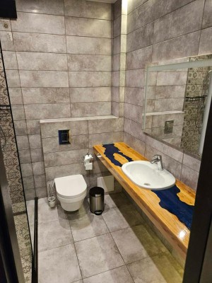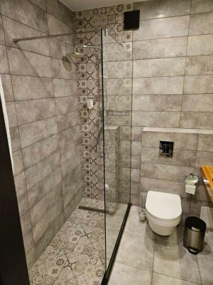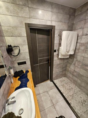- Стильна ванна кімната – душова кабіна, дизайнерська плитка