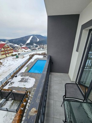 - Панорамний вид на гори, підйомник та басейн