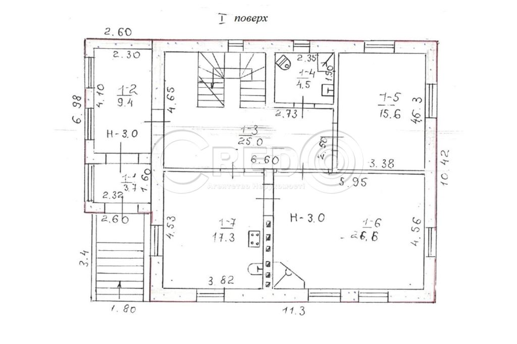 - 1 поверх: гостьова 26.6кв.м., кухня столова 17,3кв.м., кабінет 15,6кв.м., с/вузол 4,5кв.м
