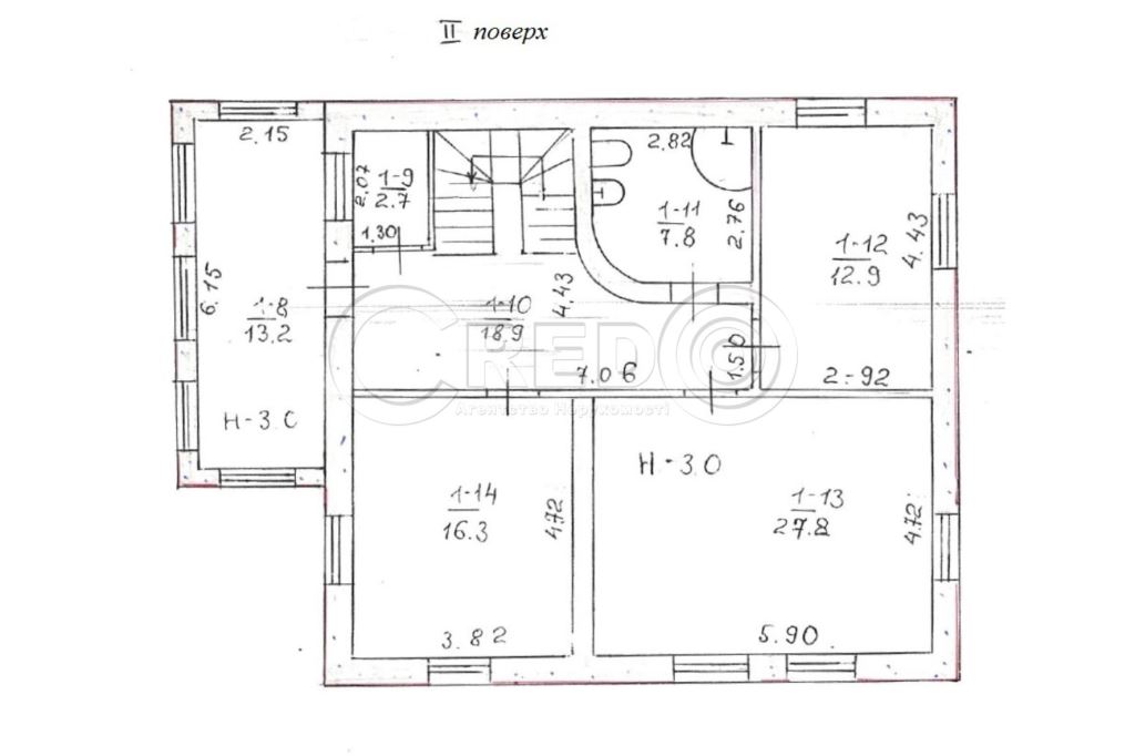 - 2 поверх: спальня 27,8кв.м., спальня 12,9кв.м., спальня13,2кв.м., с/вузол 7,8кв.м., кабінет 16,3кв.м.