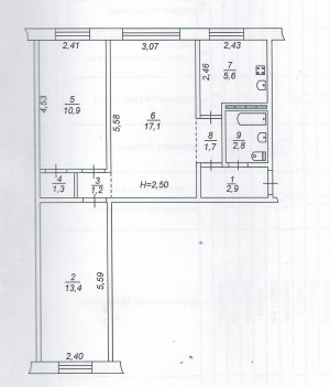Загальна площа квартири-56. 9кв.м, житлова-41. 4кв.м (17.1/ 13.4\ 10.9), Н-2.50м, кухня-5. 6кв.м, коридор-5. 8кв.м, санвузол суміщений- 2. 8кв.м, комора-1.3кв.м. Квартира двох стороння, не кутова, кімнати одна прохідна, дві роздільні, в задовільному стані, потрібен ремонт, вікна мп, труби-мп, окрім кухні всі нові батареї, підвал сухий без запахів, цоколь не високий. Квартира знаходиться в районі з добре розвиненою інфраструктурою: магазини, зупинки, парк, ринок, цирк, інститут.