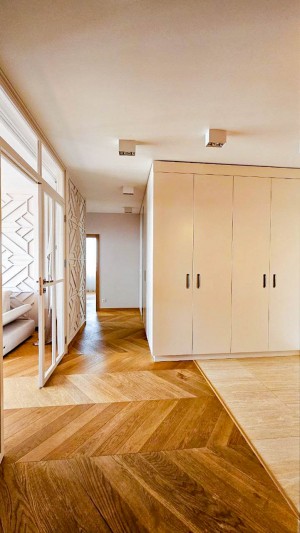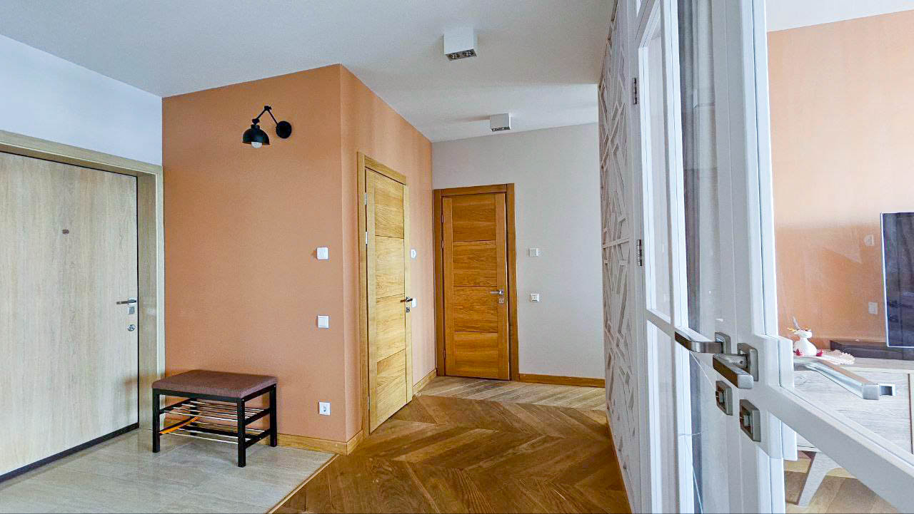 Дизайнерський ремонт у спокійних теплих тонах (беж, дерево).
