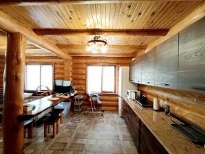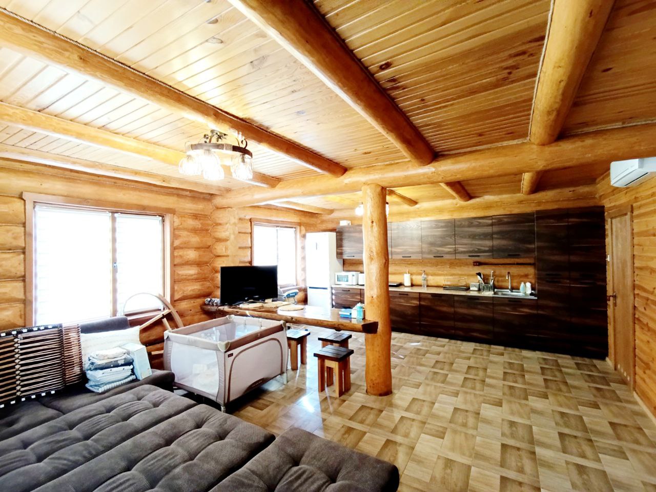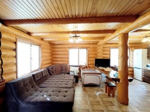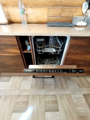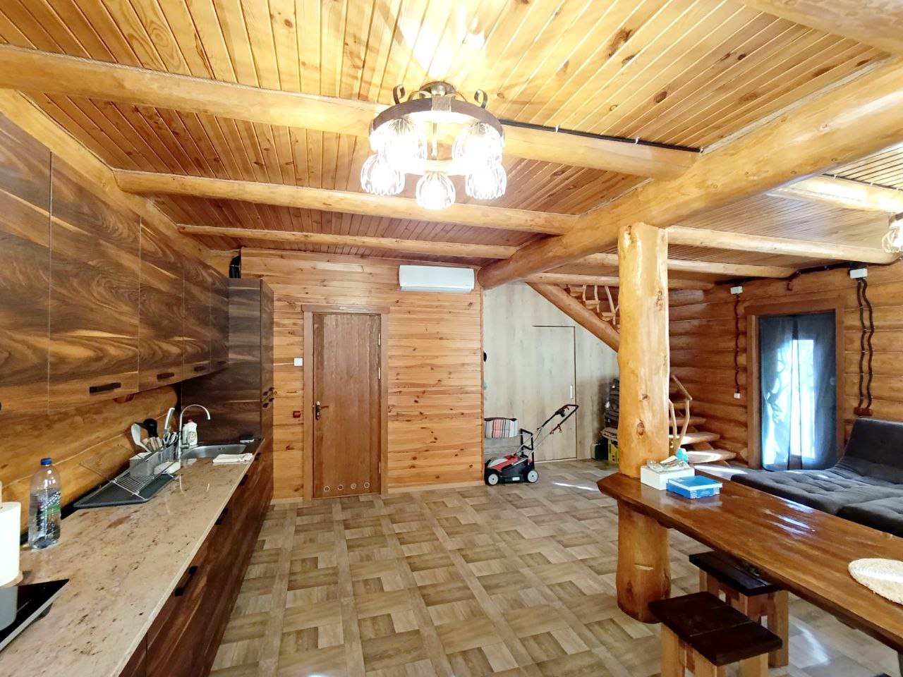 1 поверх: вітальня – кухня 40 м.кв. + санвузол 3.3 м.кв і сходи на 2 поверх (сходи так само зроблені з суцільного дерева, на фото видно). Кухня вмонтована, вся техніка присутня – духова шафа, посудомийка (45), холодильник, мікрохвильова піч, витяжка, пральна машина (все нове, усе залишається). Диван розкладний, стіл вмонтований (теж дерев’яний). Санвузол – душова кабіта, туалет, бойлер на 90 літрів. Опалення 1-й поверх електричне – тепла підлога.
