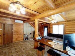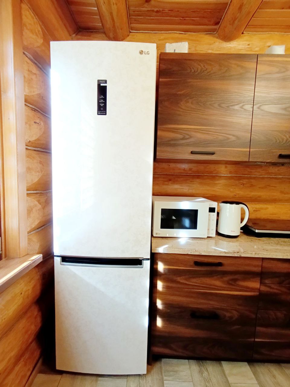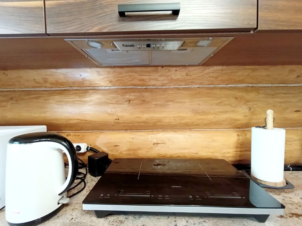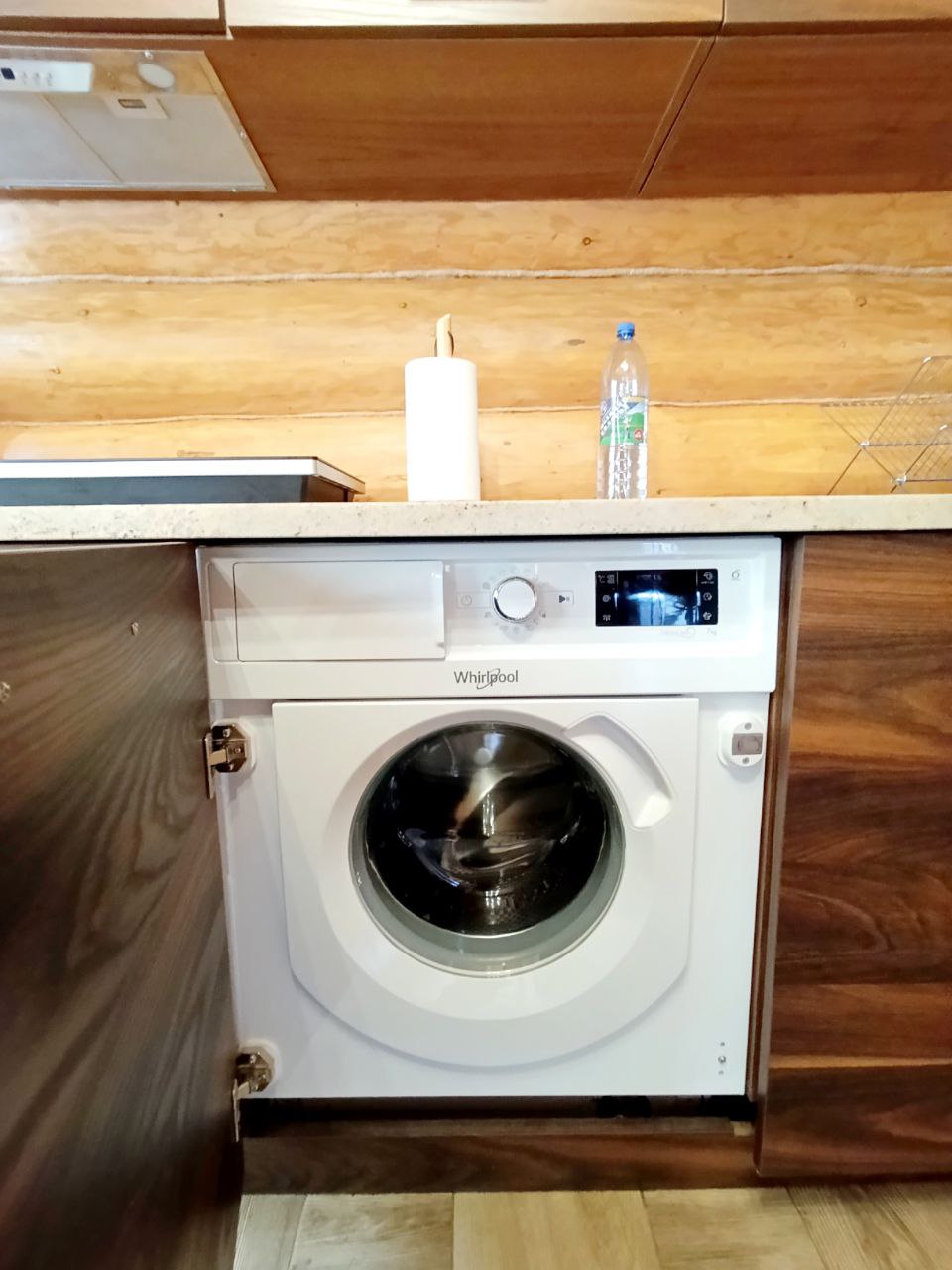 1 поверх: вітальня – кухня 40 м.кв. + санвузол 3.3 м.кв і сходи на 2 поверх (сходи так само зроблені з суцільного дерева, на фото видно). Кухня вмонтована, вся техніка присутня – духова шафа, посудомийка (45), холодильник, мікрохвильова піч, витяжка, пральна машина (все нове, усе залишається). Диван розкладний, стіл вмонтований (теж дерев’яний). Санвузол – душова кабіта, туалет, бойлер на 90 літрів. Опалення 1-й поверх електричне – тепла підлога.