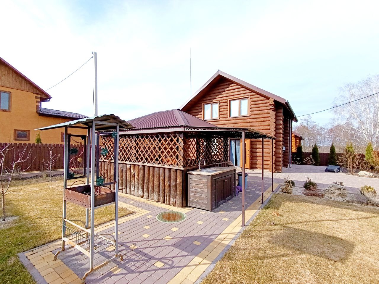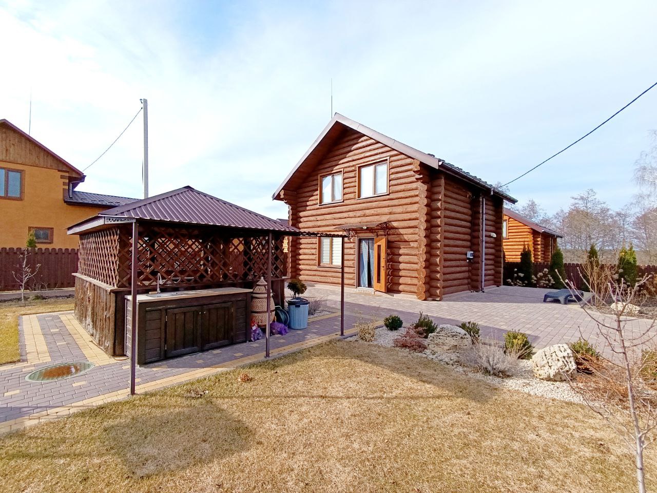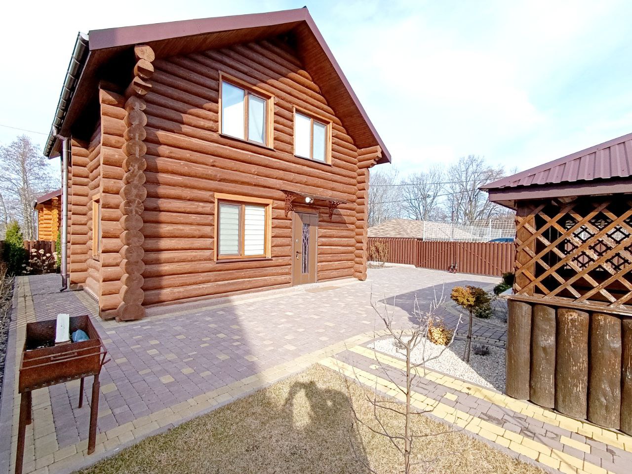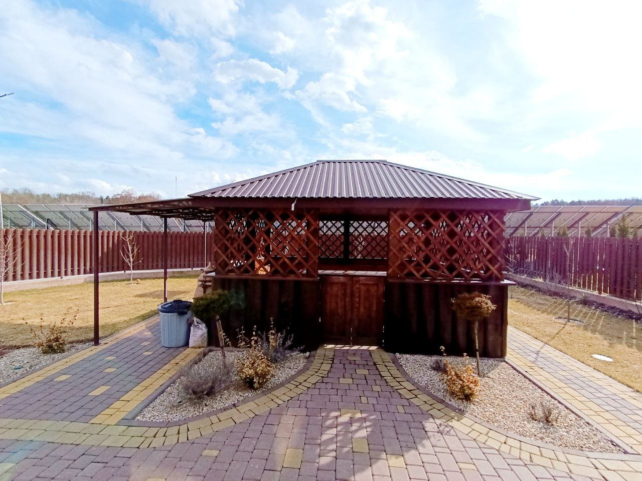 Ділянка з ландшафтним дизайном: газон, плодові дерева, квіти, декоративні рослини на все встановлено авто полив. Територія будинку огороджена сучасним парканом, по периметру брущатка, під’їзд по території також брущатка. На частині ділянці стоять сонячні панелі 30 кВт. (зелений тариф) продається усе разом. На території альтанка с зоною барбекю, в альтанку виведена вода і каналізація.