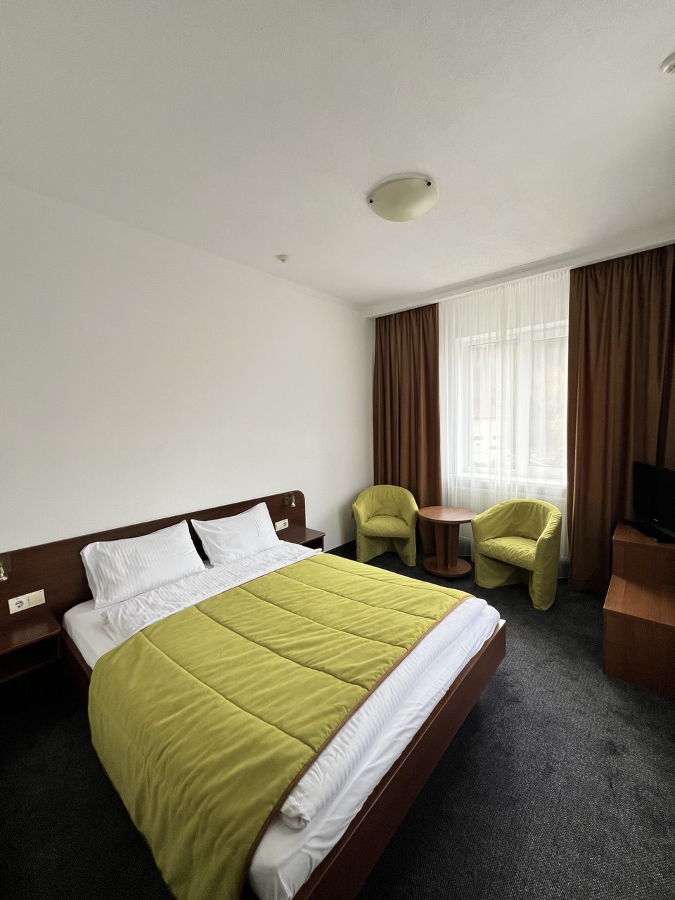 Пропонуємо готельний номер загальною площею 30,6 кв.м на третьому поверсі з виглядом на гори та річку Прут. Дві кімнати, одне односпальне та одне двоспальне ліжко, санвузол.