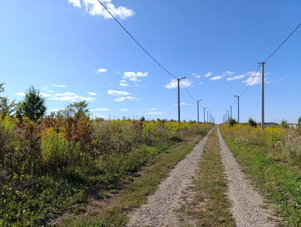 Ділянка має прямокутно-трикутної форму. Світло поруч біля ділянки, потужність поплачена 10 кВт но ще не під’єднано. Всі внески проплачені (є всі квитанції). Дорога відсипана. Район вже по тихеньку починає обживатися.