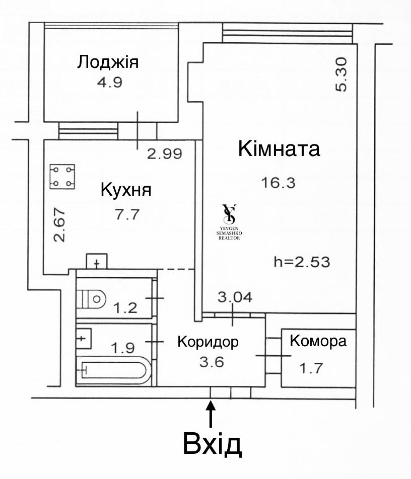 2/16 поверхового будинку. Висота стелі 2,53 м.