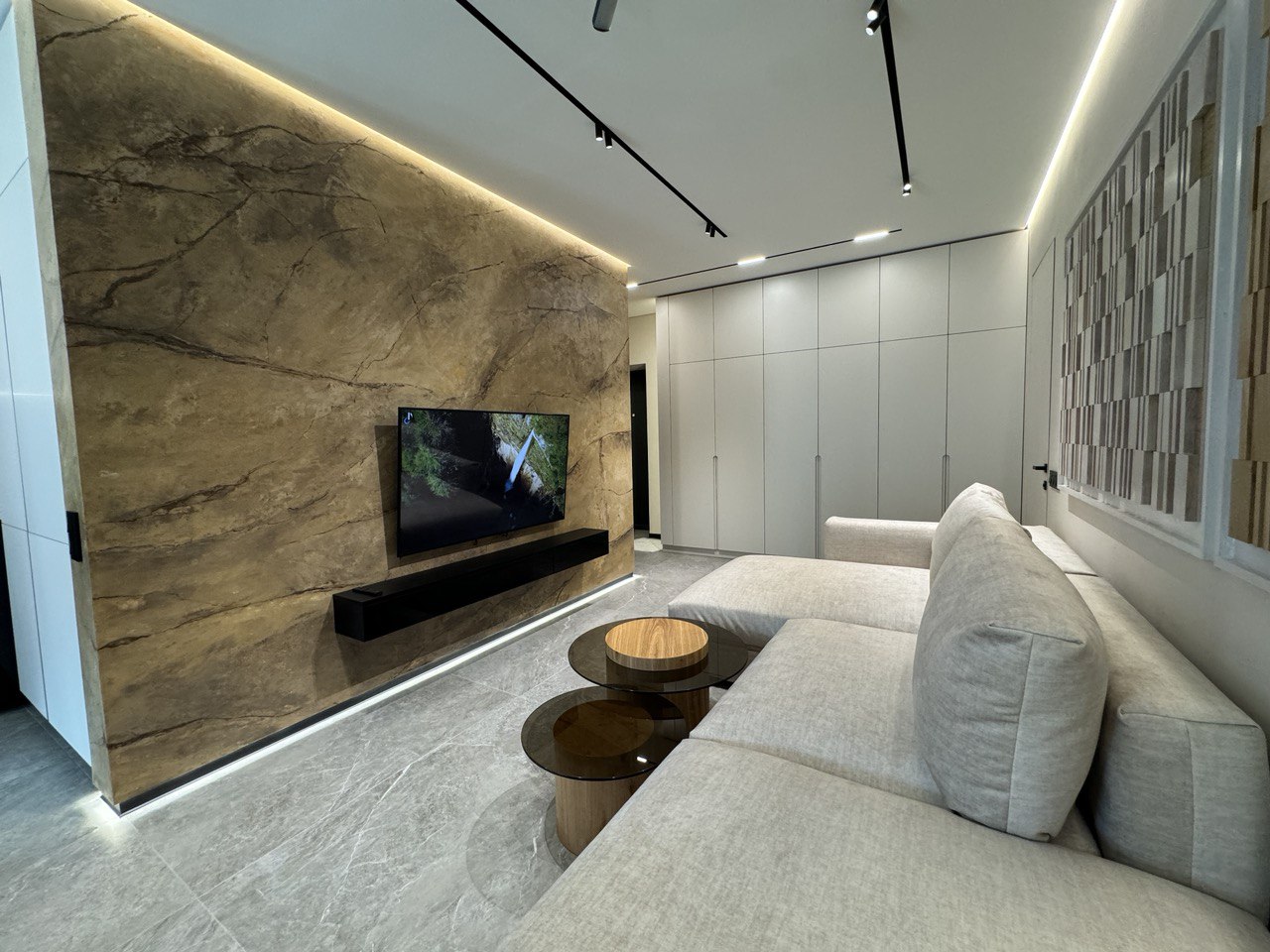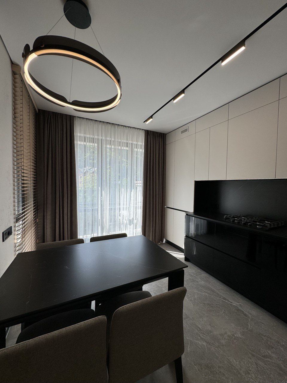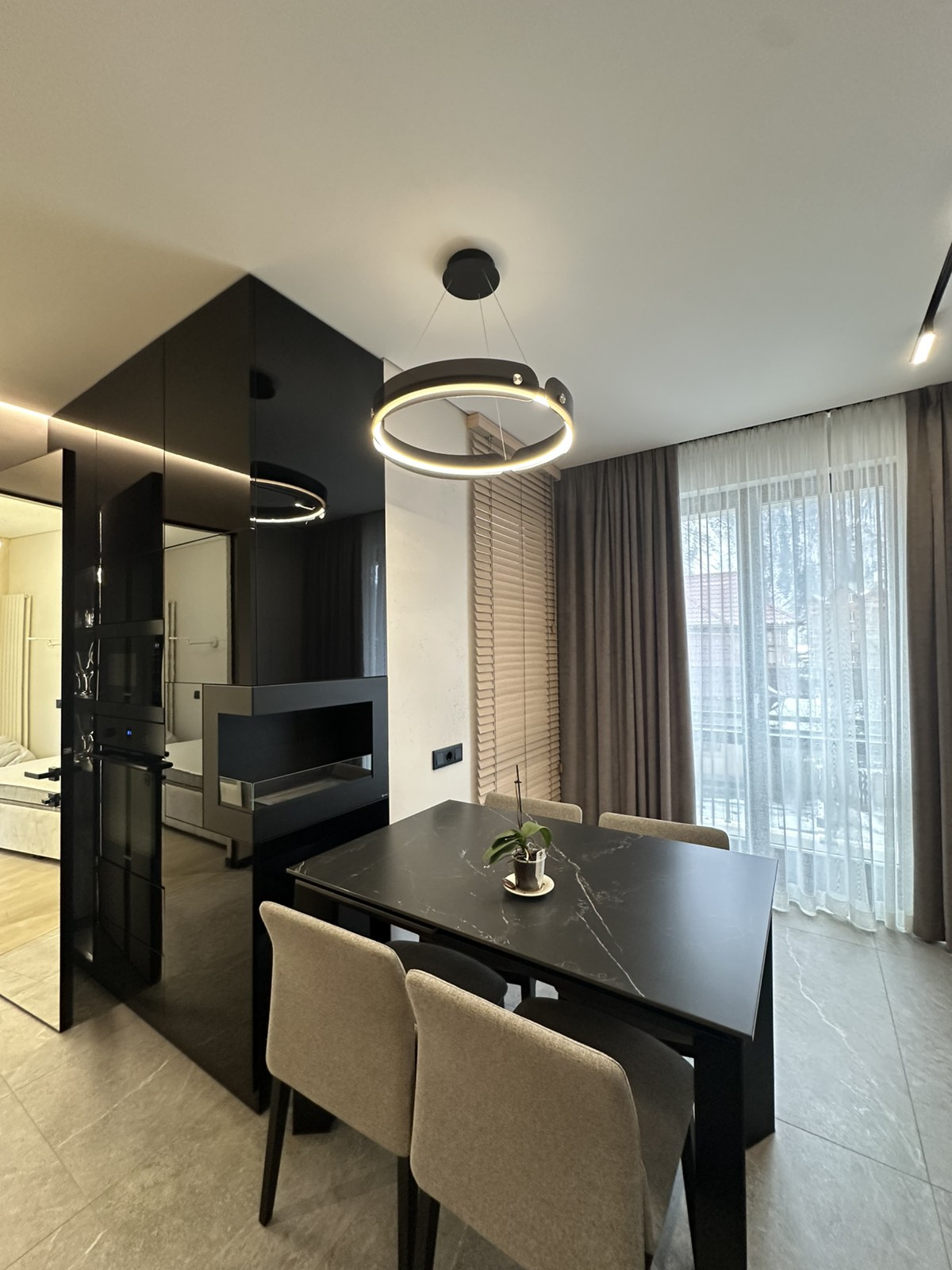 ОСНАЩЕННЯ КВАРТИРИ . всі корпусні та м’які меблі Frankoff . багато різних сценаріїв освітлення . декоративна штукатурка у всіх приміщеннях . ексклюзивна акцентна стіна під камінь, виконана вручну художниками та штукатурами . біокамін . вбудована побутова техніка . кондиціонер