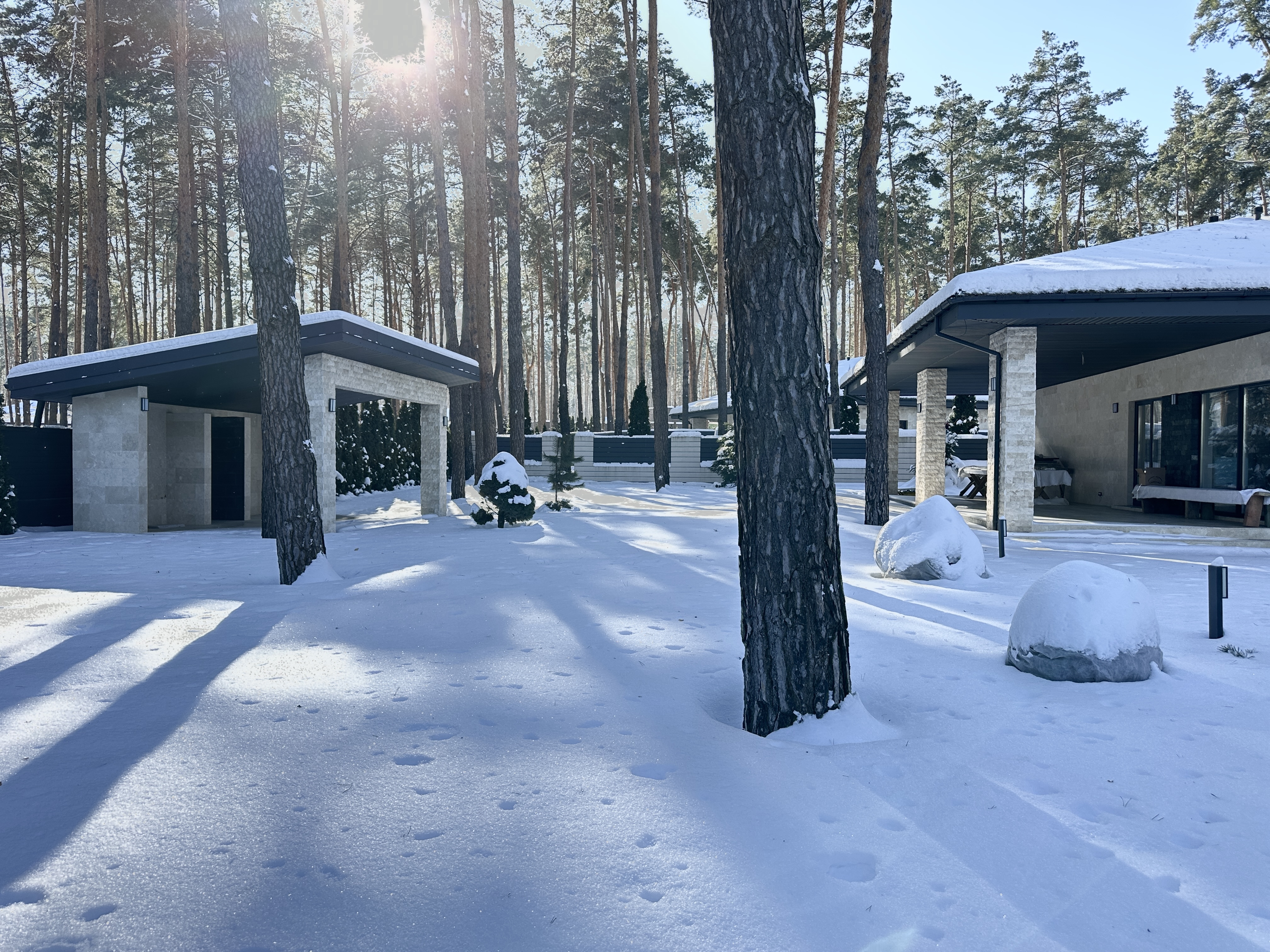 Одноповерховий будинок з терасою, басейном та ландшафтним дизайном серед сосен.