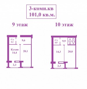 * кухня – 14.4м с выходом на балкон 2.3м;