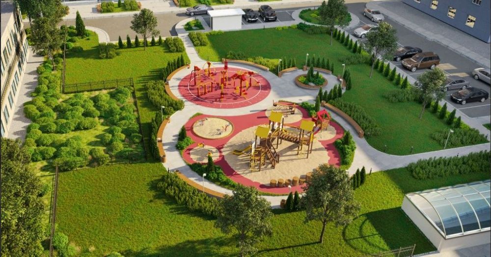 - Закрита територія біля будинку, де є ігрові та спортивні майданчики, зручні лавочки та охорона з відеоспостереженням.