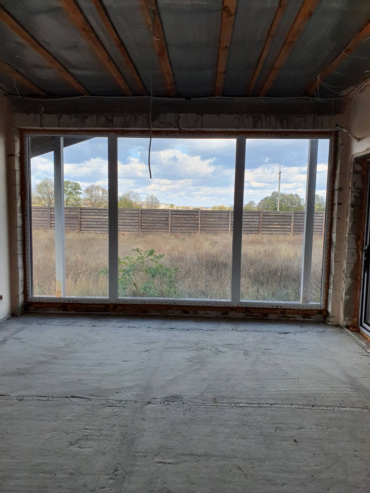 - гостиная с панорамным окном выходом на большую веранду с навесом