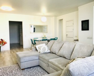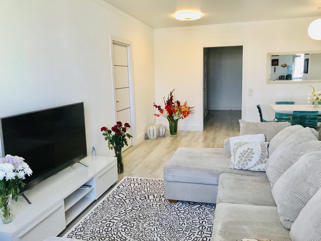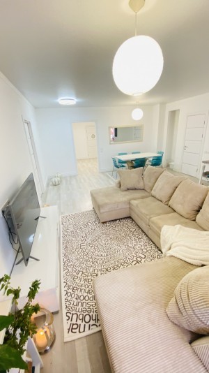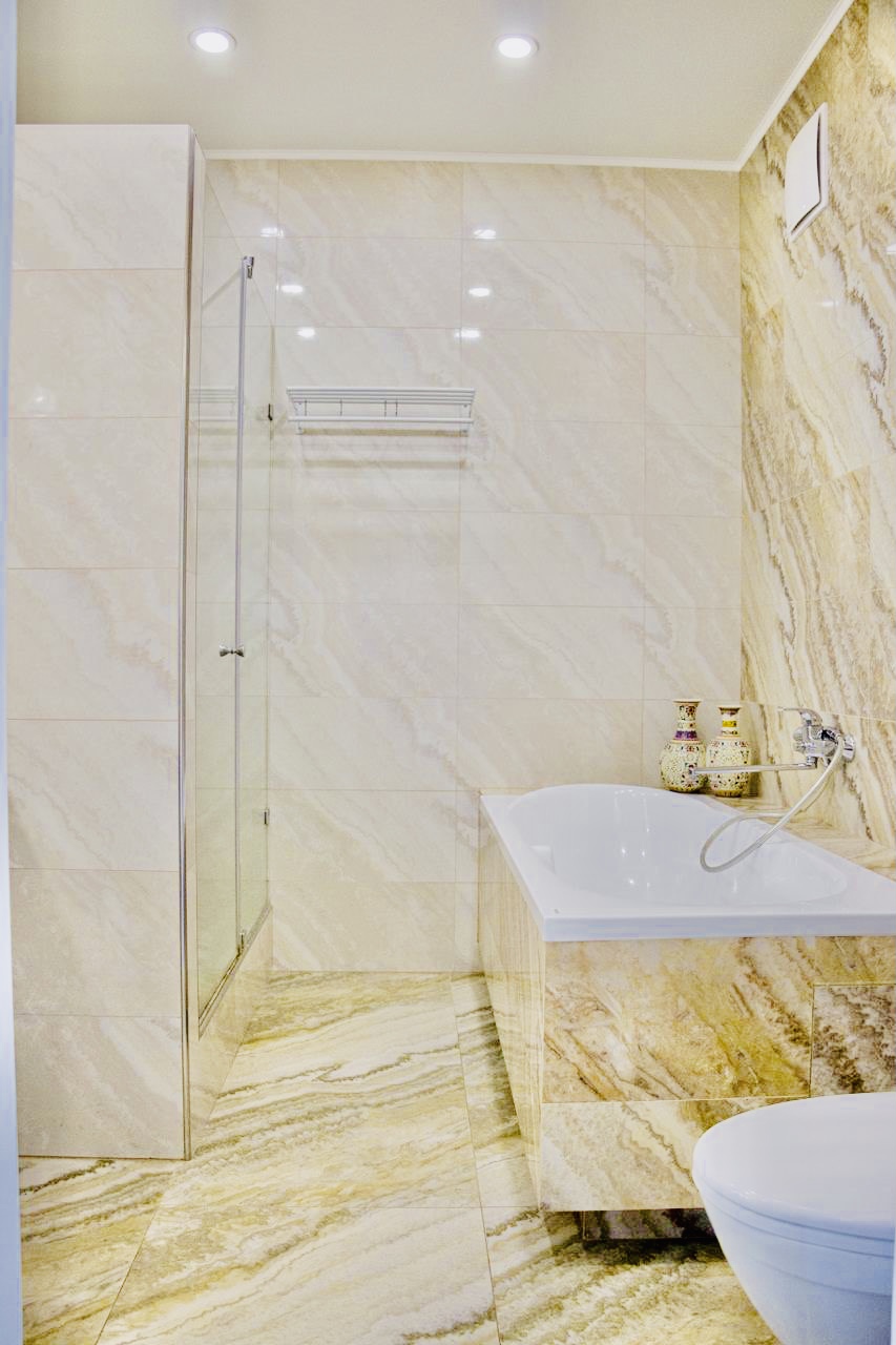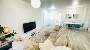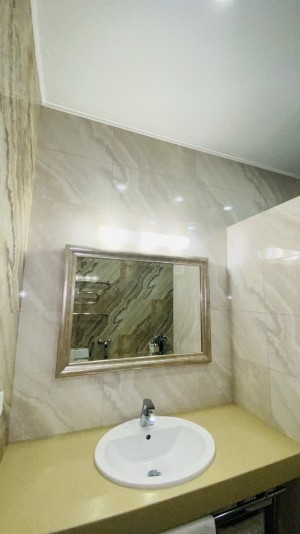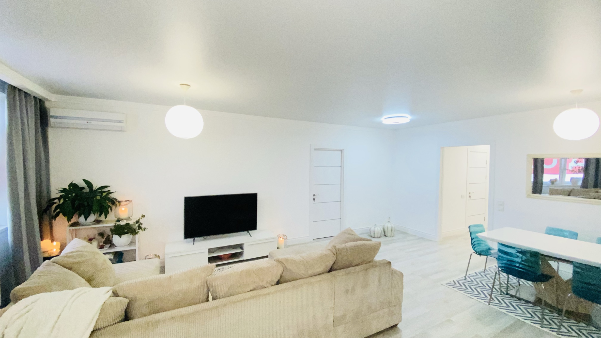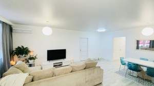 Квартира очень тёплая. Отделана в светлых тонах декоративной штукатуркой в скандинавском стиле. Полностью меблирована корпусной мебелью. Кроме кухни. Её можно оборудовать на свой вкус. Здесь есть вся техника: холодильник, духовой шкаф, варочная поверхность, посудомоечная машина. И не только на кухне. К вашим услугам 2 стиральные и сушильная машины, 2 бойлера, 5 кондиционеров, телевизоры. Установлены счётчики тепла и воды – сплошная забота о каждой бытовой мелочи.