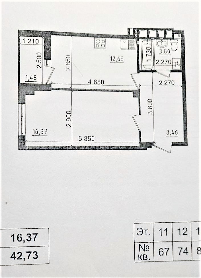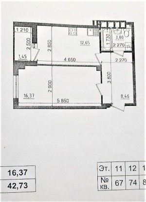 Загальна площа 42,73 кв. м: площа кухні 12,65 кв. м, житлова 16,37 кв. м, передпокій, балкон. Не кутова.