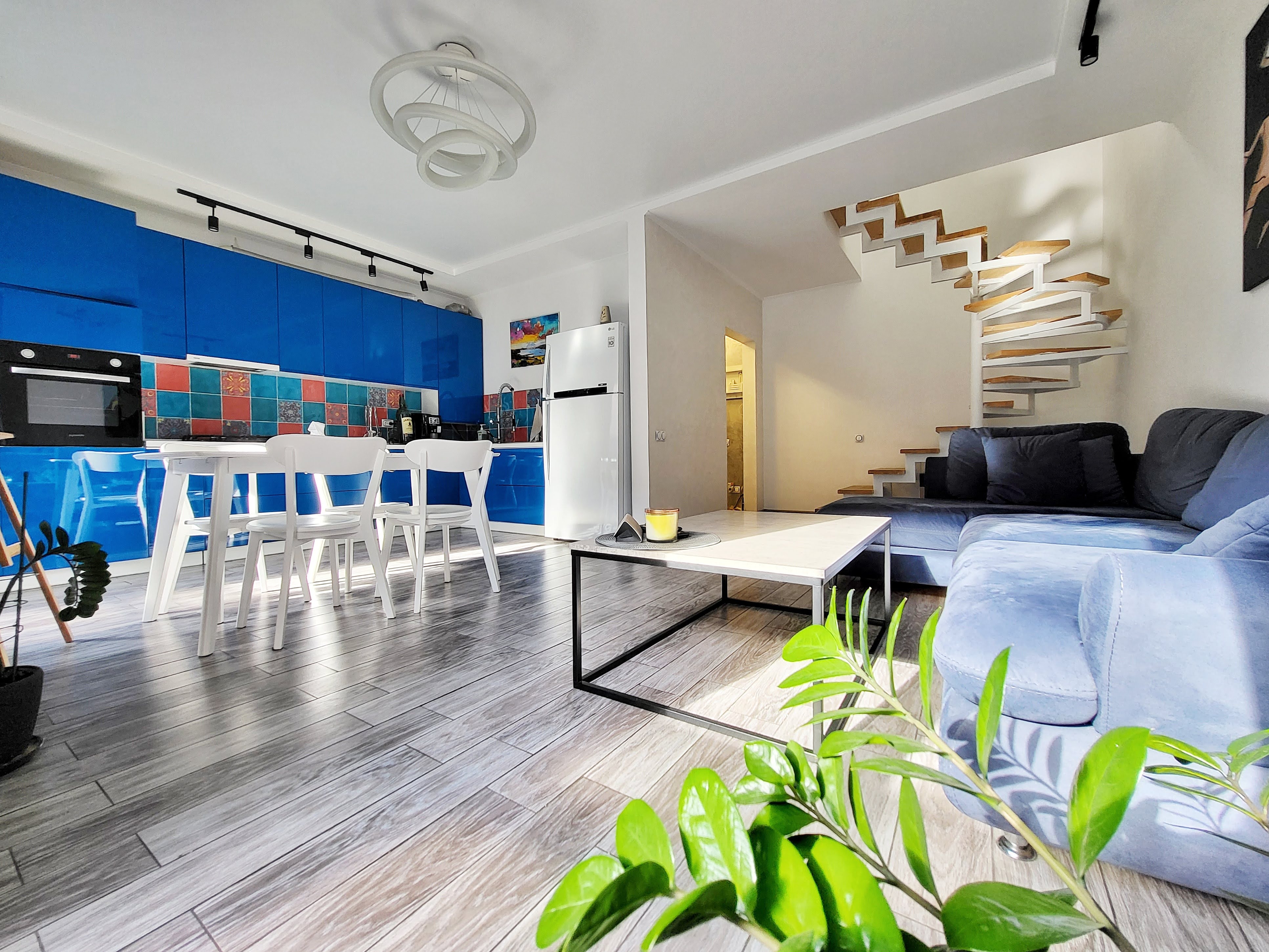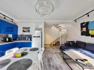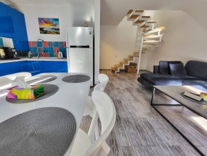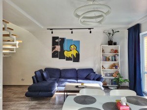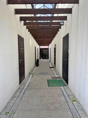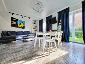 -1 поверх – вітальня з вбудованою шафою, простора гостьова з зручним диваном, обладнана технікою кухня суміщена з зоною їдальні; сан.вузол; задній, власний, огроджений дворик з своїм газоном та меблями для відпочинку;