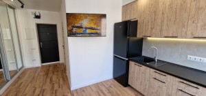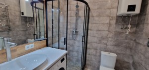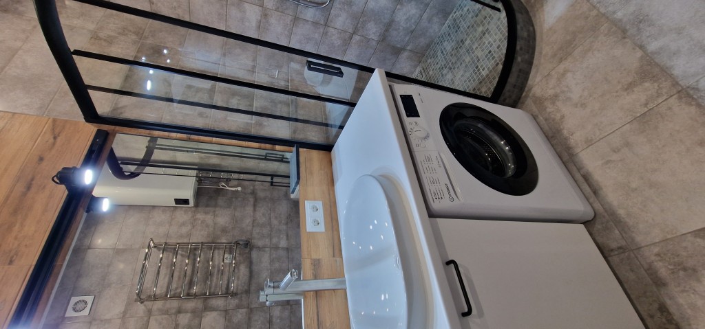 Тепла підлога, пральна машина, духовка, варильна поверхня, бойлер, велика шафа, вбудована кухня, кондиционер, німецька душова кабіна та виложений мозаїкою піддон душової кабіни, Смарт-ТВ, інтернет, диван, великий стіл для праці та відпочинку.