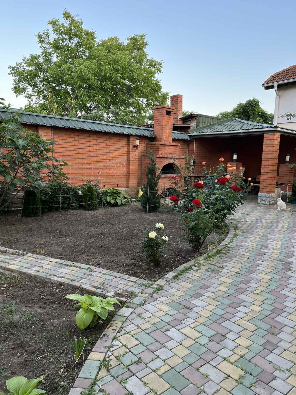 На участке оборудована зона отдыха с барбекю и капитальная крытая беседка из красного кирпича, двор выложен тротуарной плиткой, высажены деревья хвойных пород, инжир, цветочные клумбы и зеленые газоны. Есть вольер для собак.